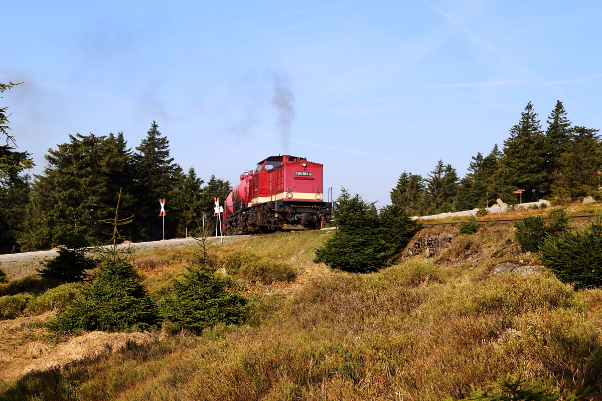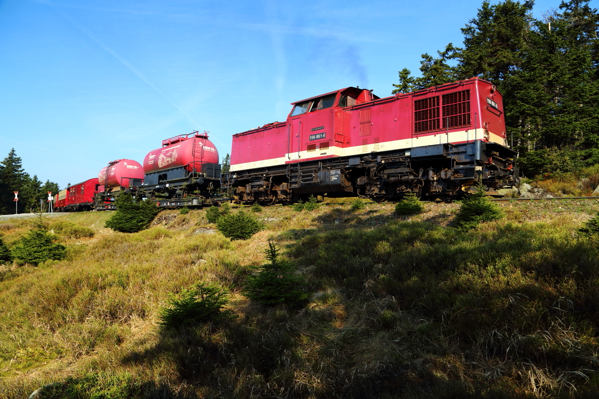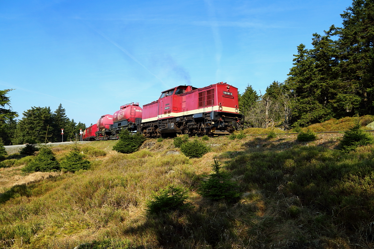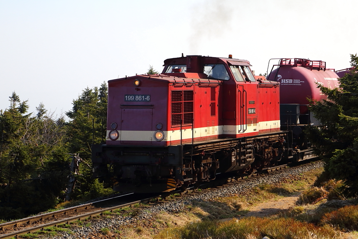 Scheinanfahrt von 199 861 mit Sonder-GmP am 21.04.2018 beim Heinrichshöhemoor, kurz vor Erreichen des Brockenbahnhofes. (Bild 1) Aufgrund der hier sehr starken Steigung hat selbst die immerhin 1100 PS starke Maschine doch so einige Mühe, den Zug in Fahrt zu bringen, denn insbesondere die beiden randvoll mit Löschwasser gefüllten Regelspur-Kesselwagen, die aufgrund Hangabtriebskraft naturgemäß in die andere Richtung wollen, stellen ein erhebliches Gewicht dar! Die Anfahrt war so spektakulär, daß ich mich entschied, sie hier mal in verschiedenen Stadien zu zeigen.