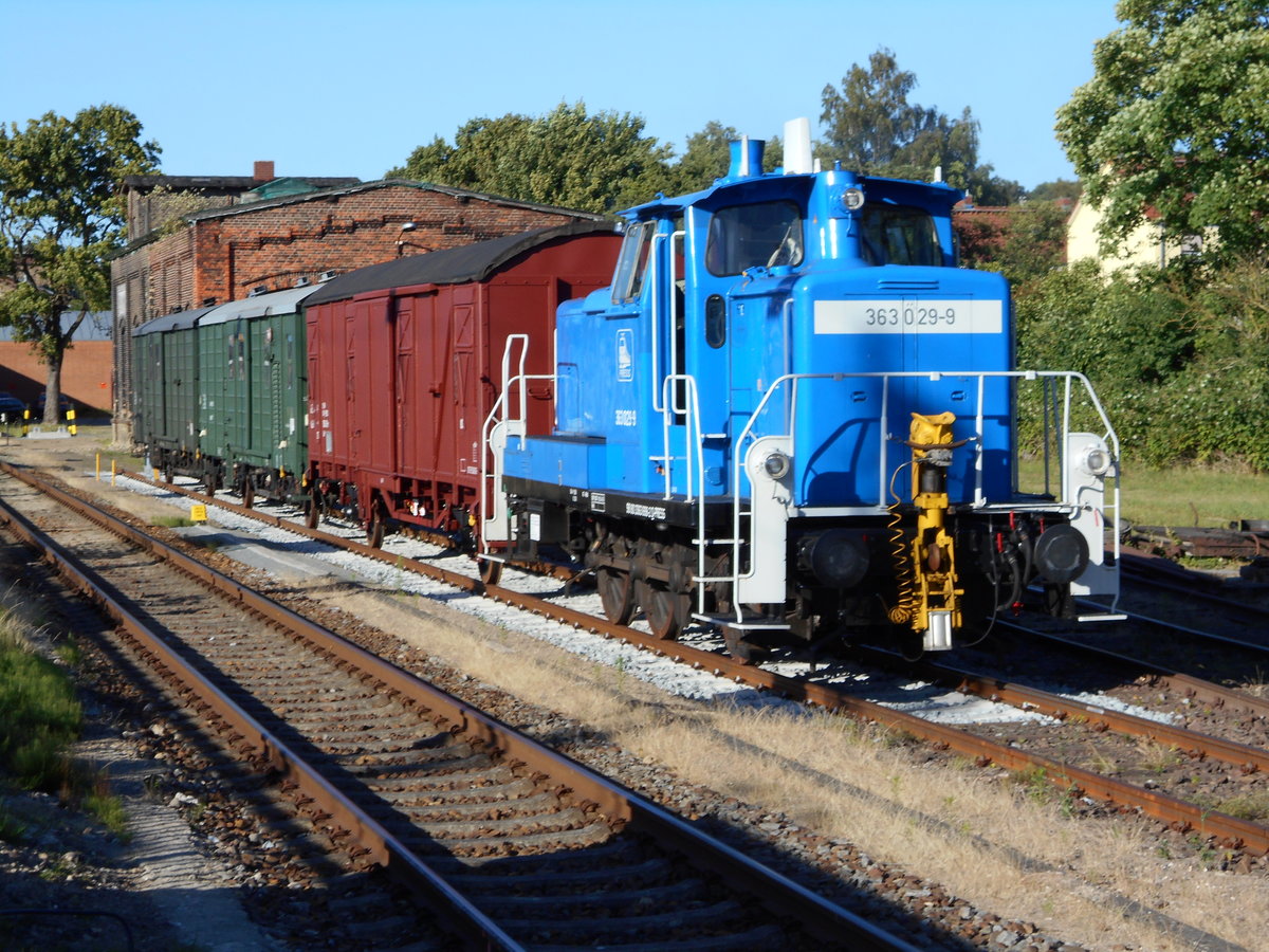 Am Abend,vom 04.Juli 2018,stand die PRESS 363 029 mit drei Gbs,am Lokschuppen,in Bergen/Rügen.