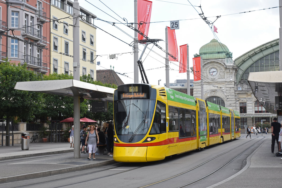 Der Be 6/8 Flexity 5003 ist zur Zeit als Sprachentram unterwegs. Hier fährt der Wagen zur Haltestelle der Linie 6 am Claraplatz. Die Aufnahme stammt vom 30.06.2018.