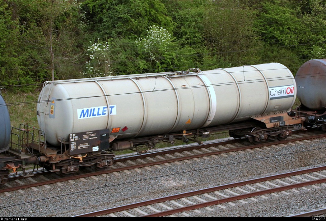 Blick auf einen französischen Kesselwagen der Gattung "Zans" (33 87 7836 347-7 F-MISA), der in einem Kesselzug mit 187 502-0 der Akiem S.A.S. für CTL Logistics eingereiht ist und in Halle-Ammendorf auf der Bahnstrecke Halle–Bebra (KBS 580) Richtung Großkorbetha fährt. Aufgenommen von der Fußgängerbrücke nahe der Europachaussee. [22.4.2018 | 18:55 Uhr]
