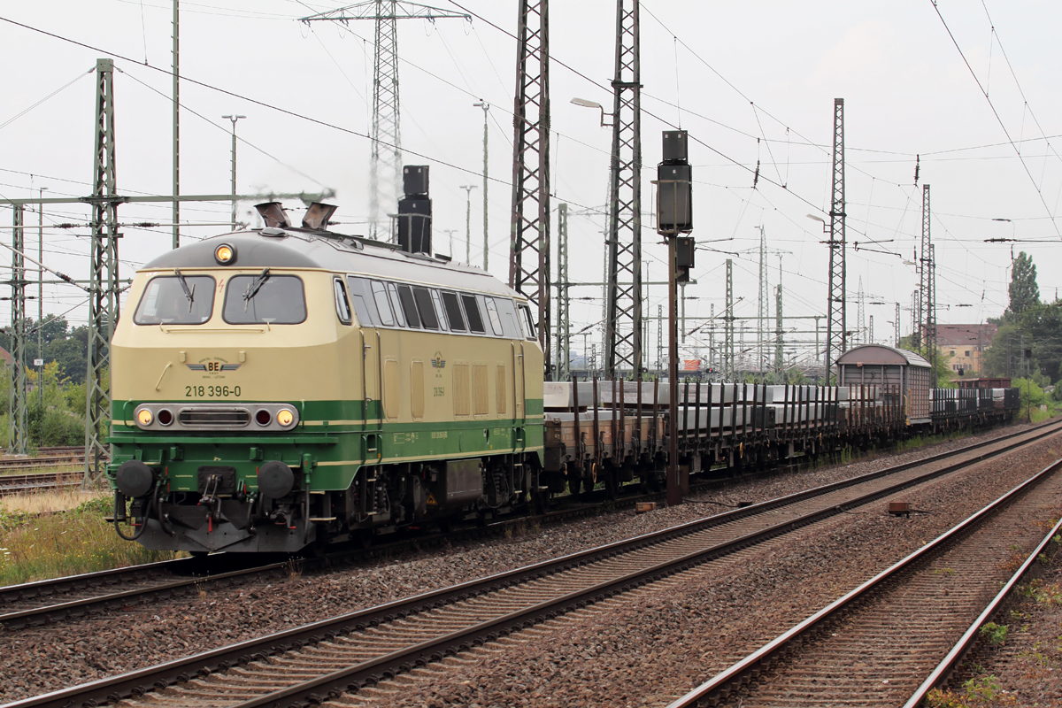 218 427-3 schiebt eine N-Wagen Garnitur durch Friedrichshafen Flughafen. 10.6.18