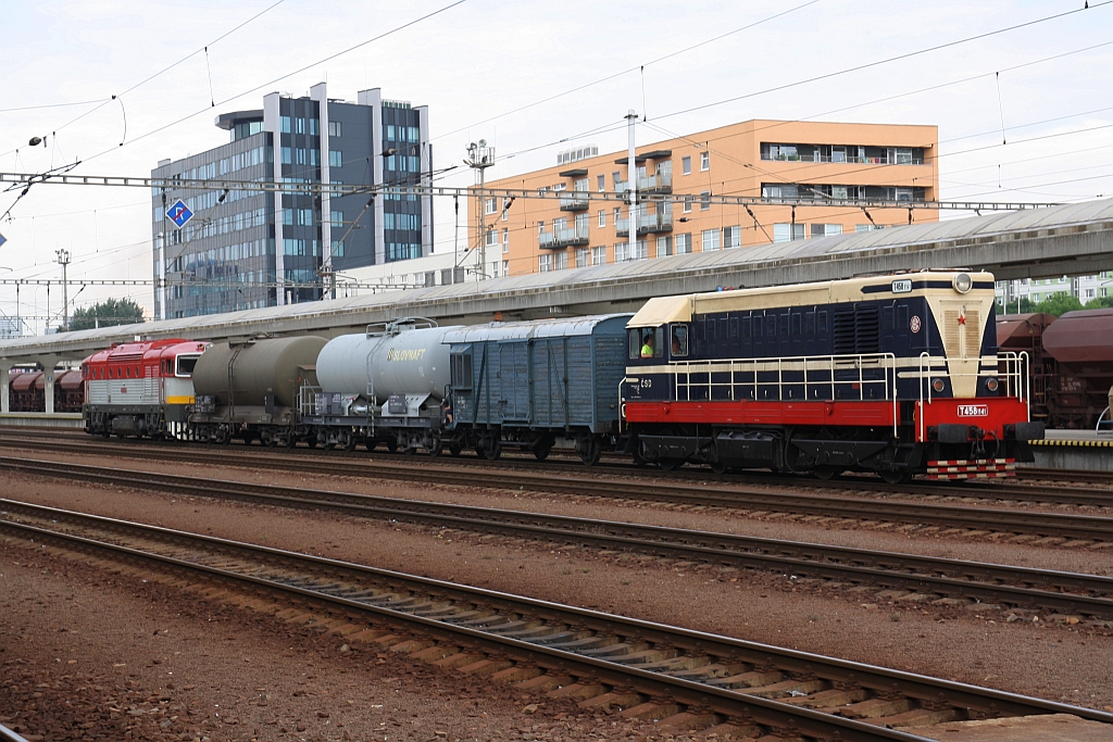 CZ-PUS 92 54 2 721 141-0, historisch angeschrieben als CSD T458 1141, am 16.Juni 2018 mit dem Feuerlöschzug im Bahnhof Bratislava Petrzalka. Am Zugschluß läuft die SK-ZSSKC 753 109-8 mit.