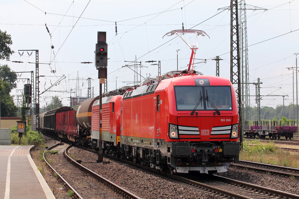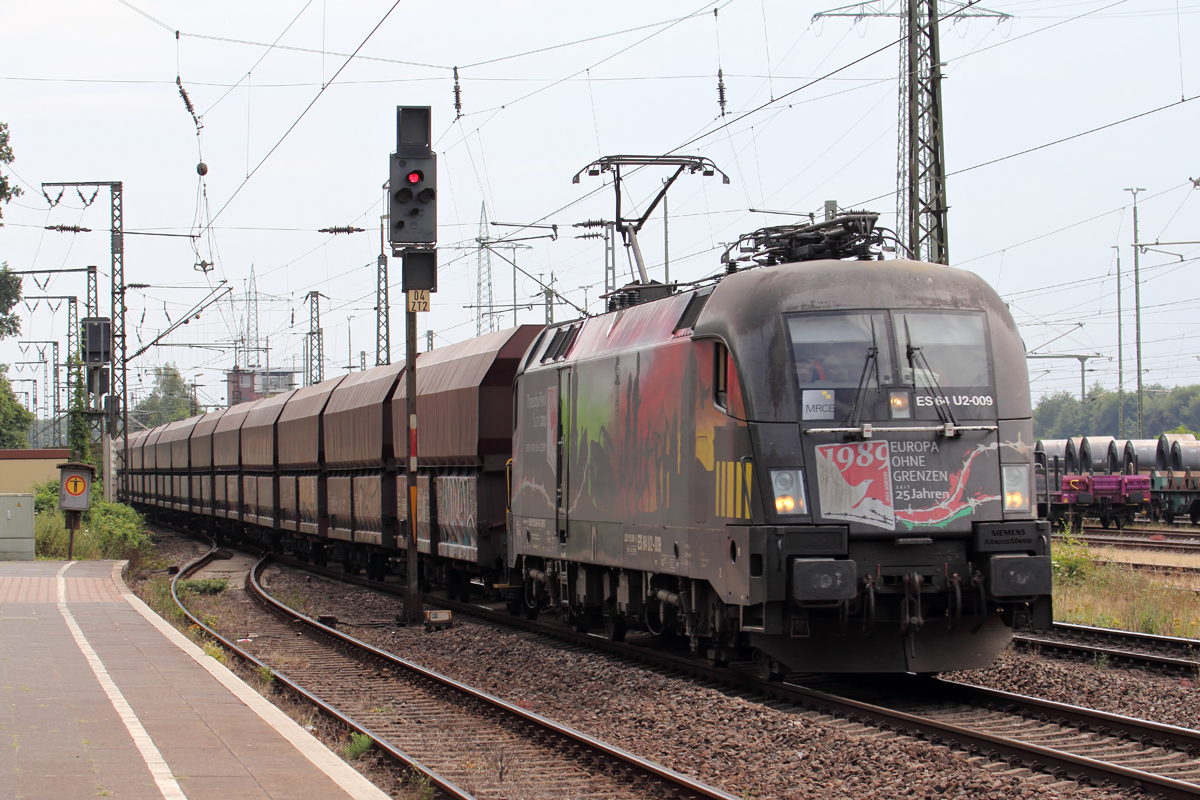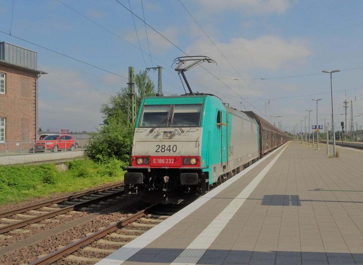 E186 232 mit einem Güterzug durchfährt den Bahnhof Rheine. Aufgenommen im Juni 2018.