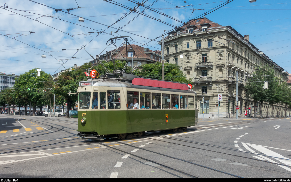 Ce 4/4 107 überquert die Hirschengraben-Kreuzung von der Bundesgasse in die Effingerstrasse. Das Teilstück der Bundegasse zwischen Schwanengasse und Hirschengraben wird im Planbetrieb mit Passagieren nicht befahren.