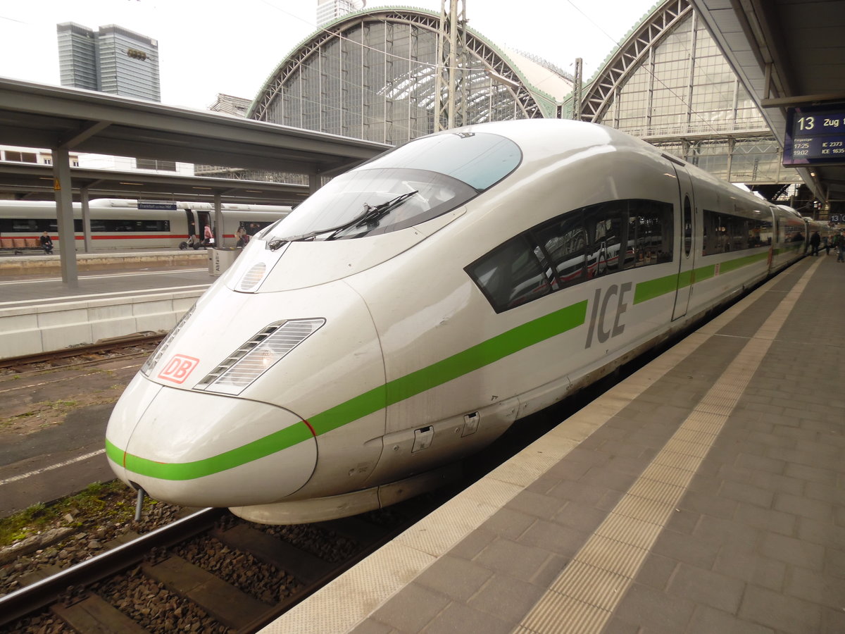 Hier steht ein ICE 3 (Baureihe 403) mit einem grünen Zierstreifen im Frankfurter Hauptbahnhof.