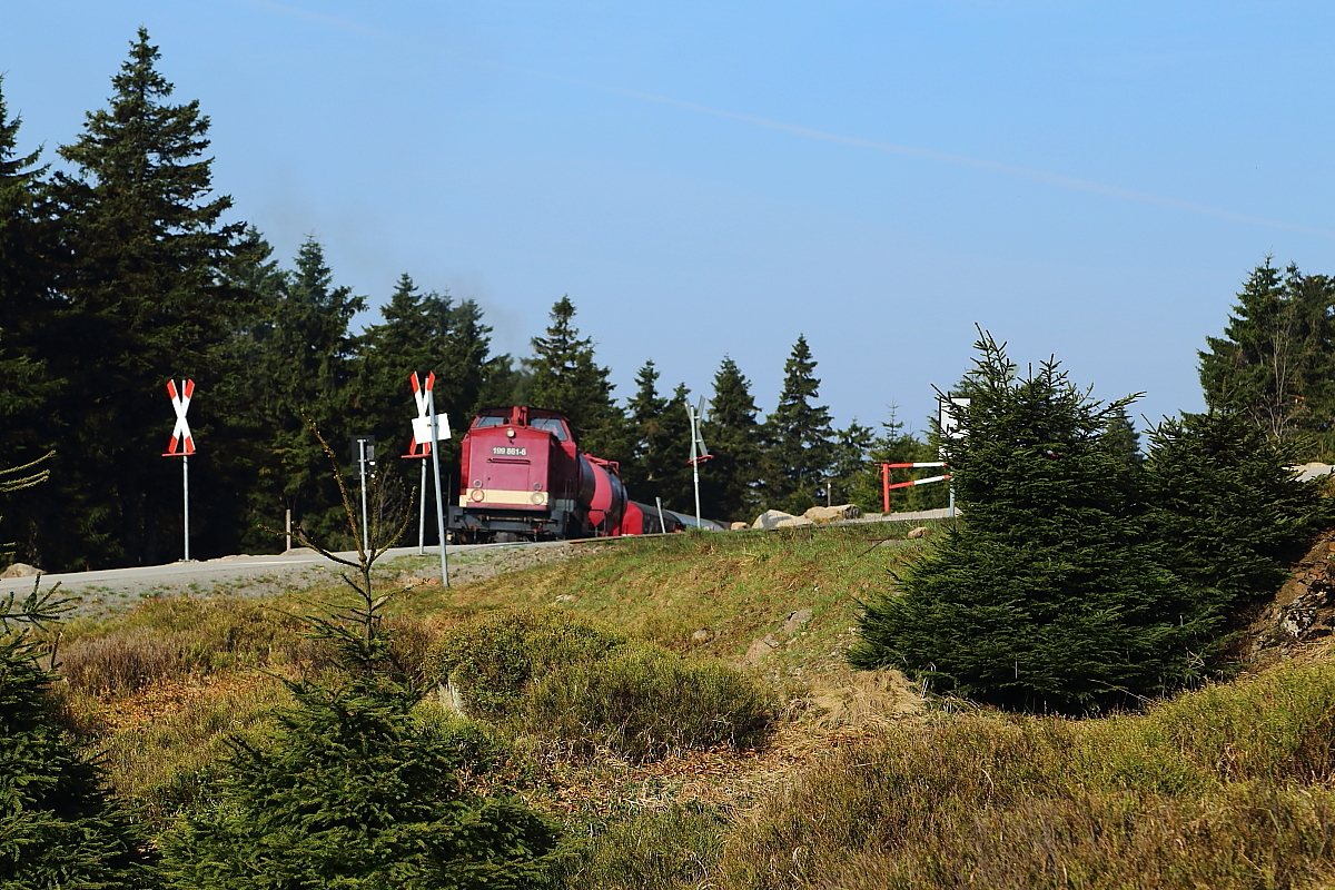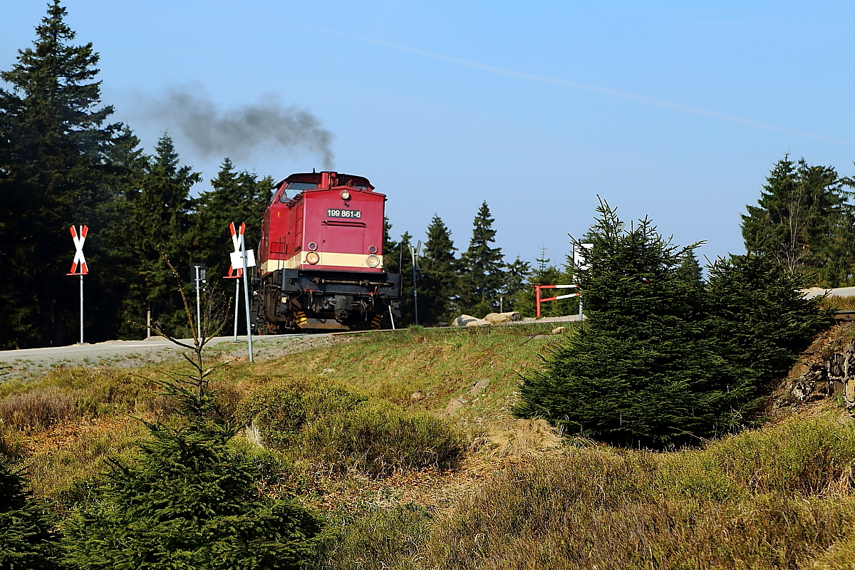 Scheinanfahrt von 199 861 mit Sonder-GmP am 21.04.2018 beim Heinrichshöhemoor, kurz vor Erreichen des Brockenbahnhofes. (Bild 4)