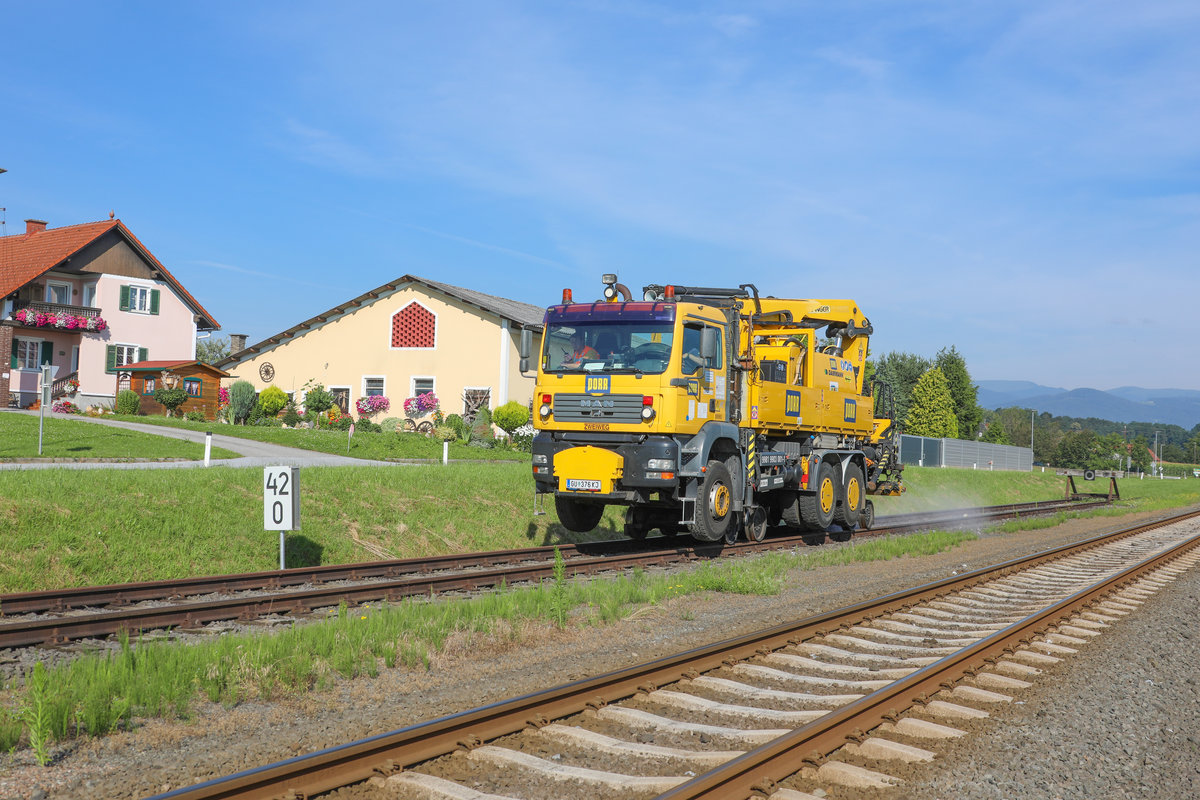 99819903001-1 war in den letzten Tagen am Netz der Graz Köflacher Eisenbahn unterwegs um dem Unkraut Herr zu werden.