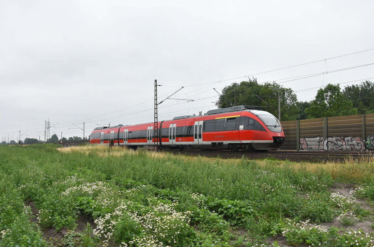 Talent 644 539 der Hochrheinbahn bei der Überführung kommend aus Lüneburg. Höhe Bardowick, 26.06.2018.
