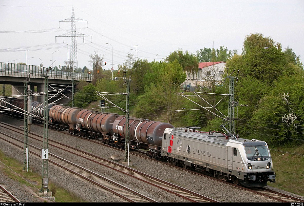 Vor etwa 2 Stunden als Tfzf in Schkopau gesehen, fährt 187 502-0 der Akiem S.A.S. für CTL Logistics jetzt als Kesselzug in Halle-Ammendorf auf der Bahnstrecke Halle–Bebra (KBS 580) Richtung Großkorbetha. Aufgenommen von der Fußgängerbrücke nahe der Europachaussee. [22.4.2018 | 18:54 Uhr]