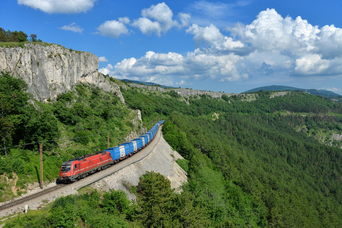 Die 182 523 TXL, "Kaiser Franz Joseph" am 05.07.18 bei Oberaudorf im Inntal in Richtung München.