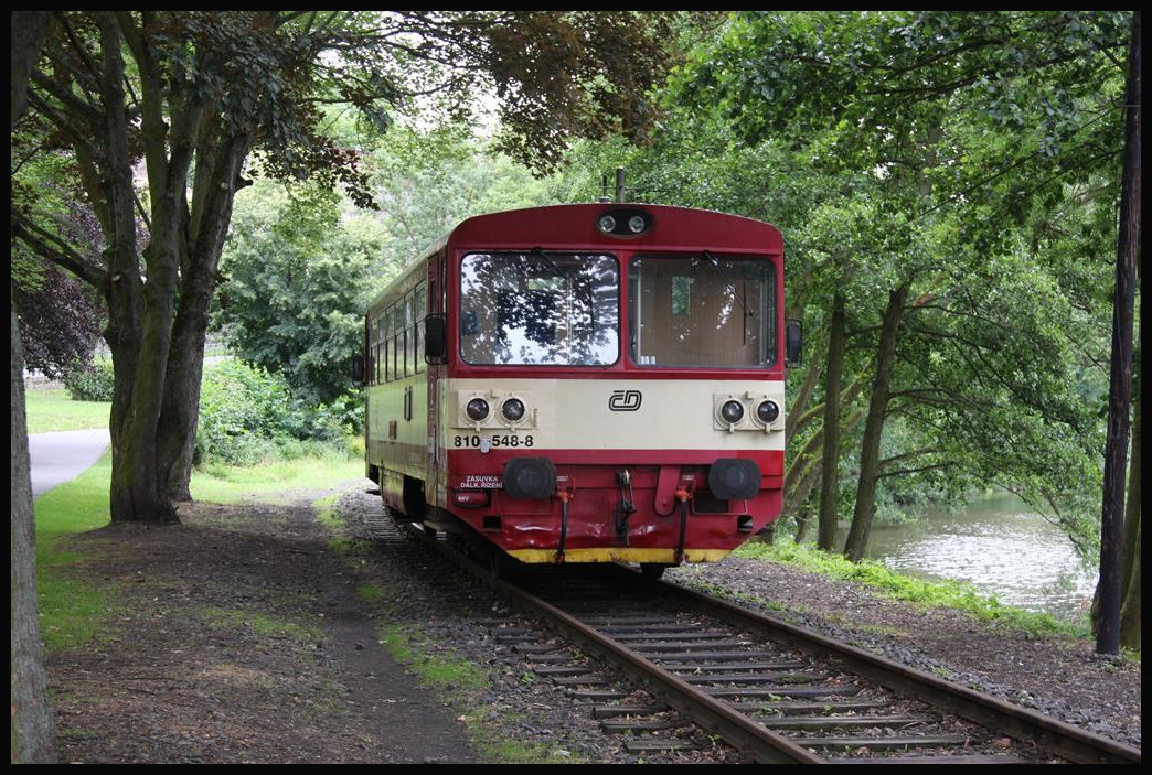 CD 810548 unterhalb der Burg Loket nahe Karlsbad. Der Triebwagen ist hier am 23.6.2018 wegen der heißen Sommerzeit im Wald abgestellt worden. Zu dieser Zeit endet der Zugverkehr aus Chodov in Loket, so dass diese Parkmöglichkeit besteht!