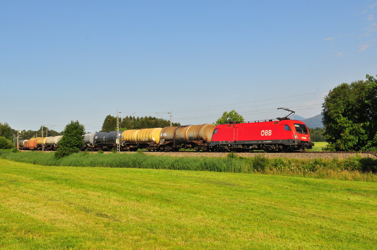 Die 1016 022-6 der ÖBB vor einem Kesselzug am 01.07.18 bei Grabenstätt.