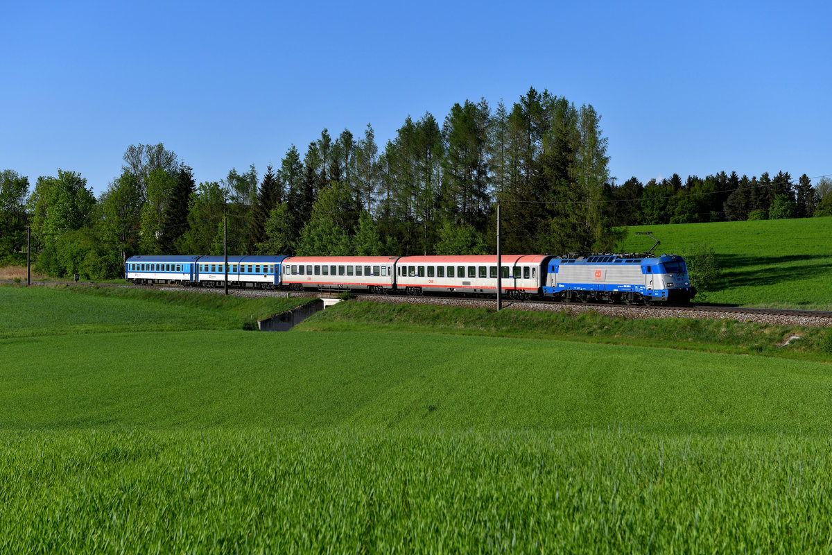 Die ČD bezeichnet die Schnellzüge zwischen Prag und Linz nun als "Jižní expres". Dies bedeutet "Süd Express". Am 30. April 2018 war die 380 005 für die Beförderung des REX 1545 eingeteilt. Bei Lest im Mühlviertel konnte ich diese Leistung aufnehmen.