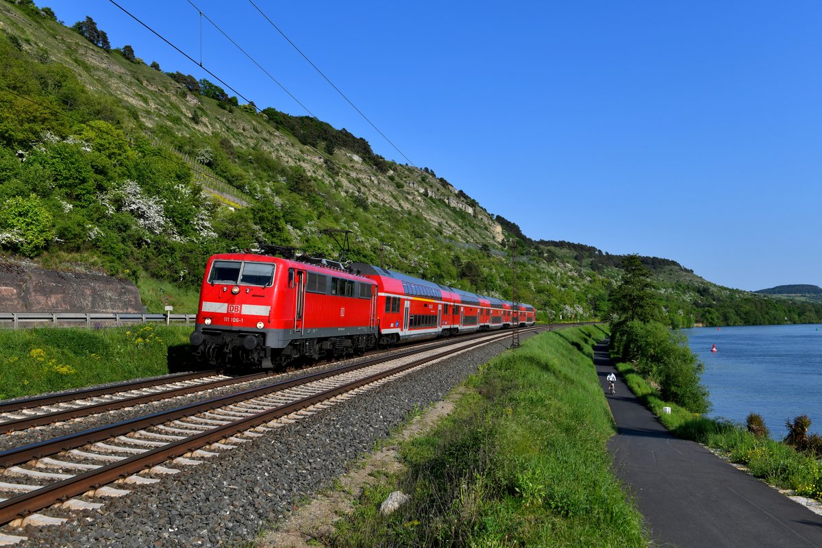 Die Umstellung der Regional-Expresse im Maintal auf die Baureihe 445 ist bereits weit fortgeschritten. Umso erfreulicher war es am 04. Mai 2018, hier noch einmal eine Lok der Baureihe 111 im Einsatz zu erleben. Die Nürnberger 111 106 brachte den RE 4626 nach Frankfurt am Main HBF und konnte bei Gambach mit Blick auf den Main dokumentiert werden. Das Wettrennen mit dem Radler gewann der Zug problemlos, aufgrund der warmen Temperaturen hatte der Lokführer sich der "manuellen Klimaanlage" in Form einer offenen Führerstandstür bedient - ein Detail, welches man bei modernen Fahrzeugen naturgemäß nicht mehr beobachten wird.