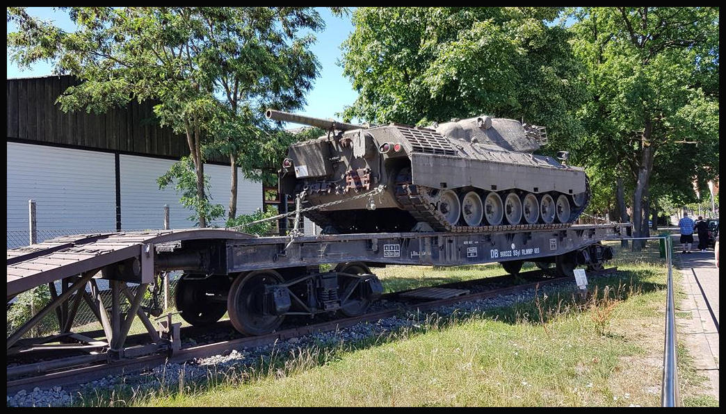 Panzer Transport Wagen der DB mit der Bezeichnung 960322 SSyl RLMMP 693 stand am 2.7.2018 beladen mit einem Leopard I Panzer vor dem Panzer Museum in Munster.
