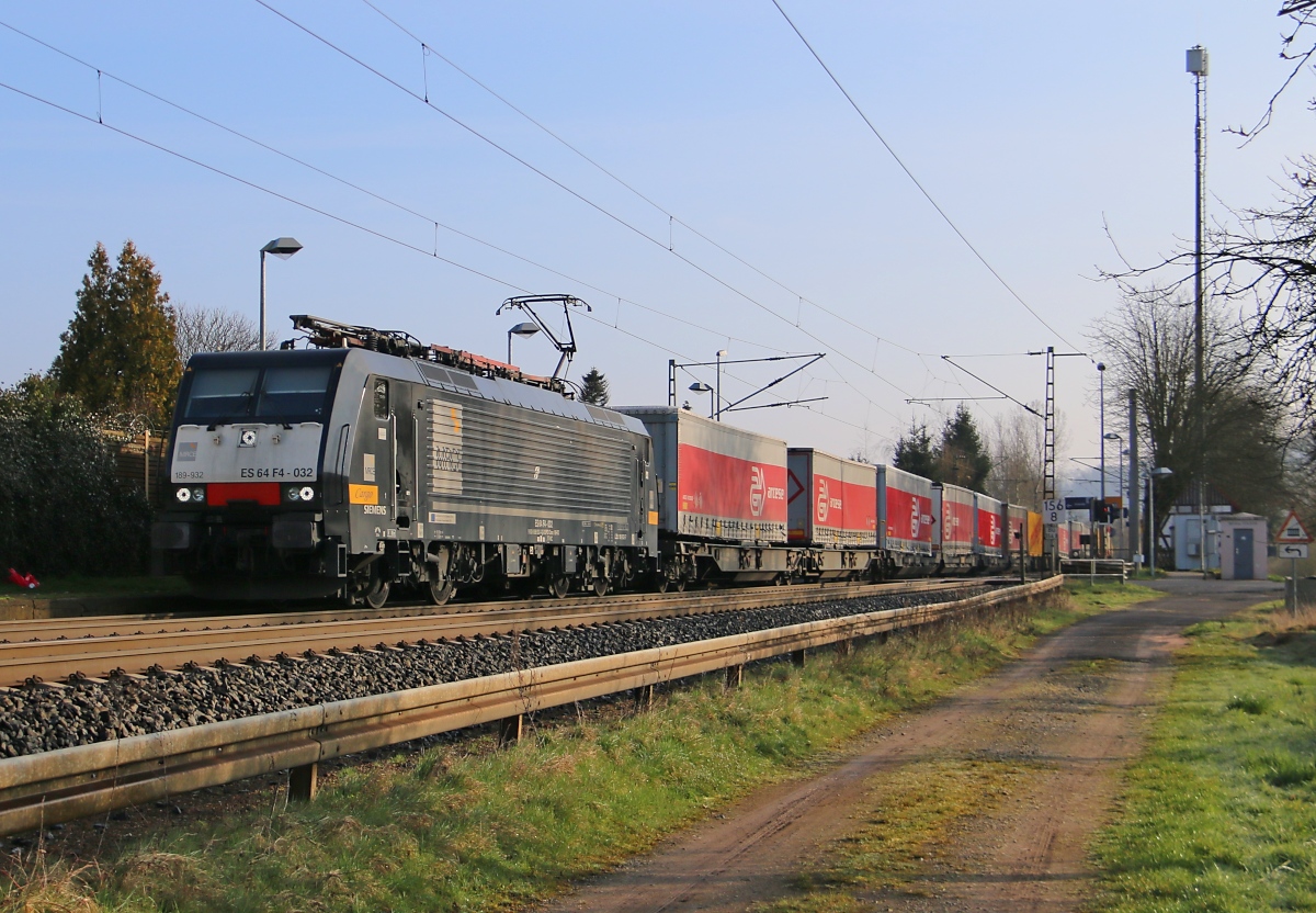 189 932 (ES 64 F4-032) mit KLV-Zug in Fahrtrichtung Süden. Aufgenommen in Ludwigsau-Friedlos am 02.04.2016.