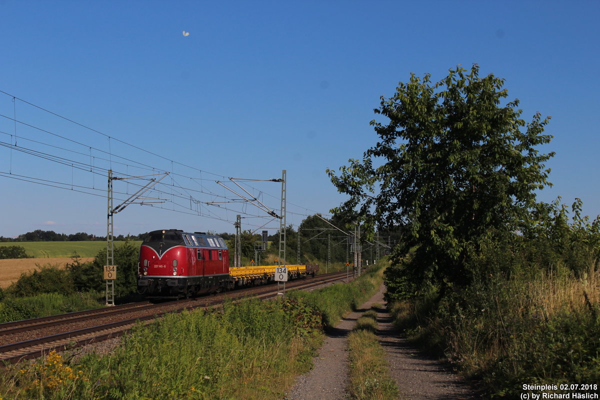 221 145-6 zieht vier Res-Wagen durch Steinpleis in Richtung Oelsnitz.
