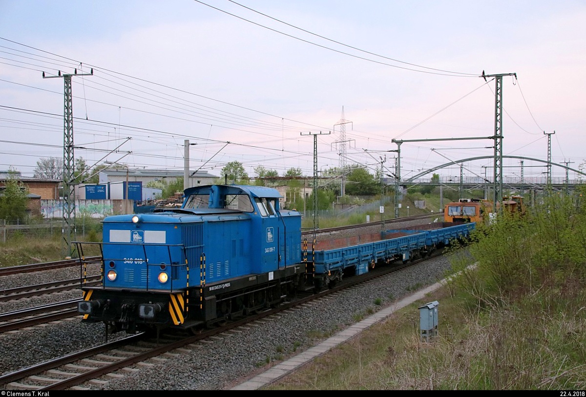 346 018-7 (DR V 60) der Eisenbahn-Bau- und Betriebsgesellschaft Pressnitztalbahn mbH (PRESS) mit leeren Flachwagen sowie Gleisstopf- und Schotterplaniermaschine fahren in Halle-Ammendorf auf der Bahnstrecke Halle–Bebra (KBS 580) in Richtung der Abstellgleise beim MSG Ammendorf. [22.4.2018 | 19:39 Uhr]