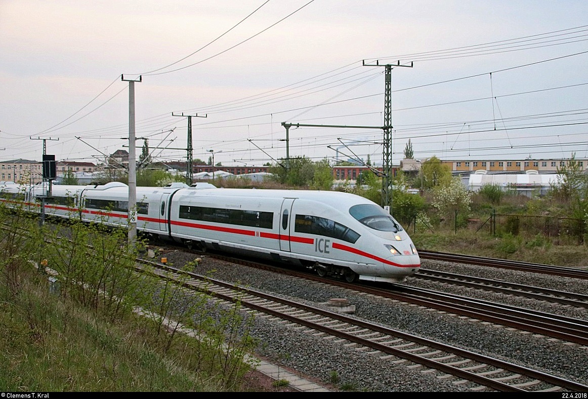 403 515 (Tz 315 "Singen (Hohentwiel)") als ICE 1633 (Linie 15) von Frankfurt(Main)Hbf nach Berlin Gesundbrunnen fährt in Halle-Ammendorf auf der Neubaustrecke Erfurt–Leipzig/Halle (KBS 580). [22.4.2018 | 19:37 Uhr]
