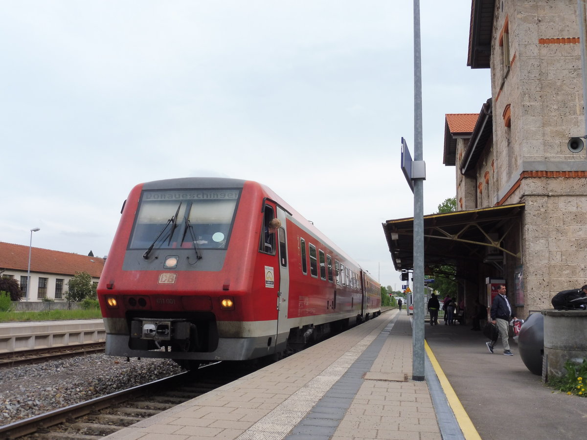 611 001 als IRE nach Donaueschingen im Bahnhof Munderkingen, Mai 2018