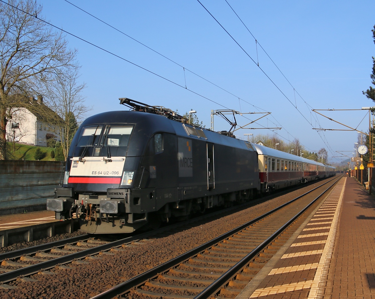 Am 02.04.2016 bespannte die 182 596 (ES 64 U2-096) einen TEE in Richtung Eisenach. Aufgenommen in Ronshausen.