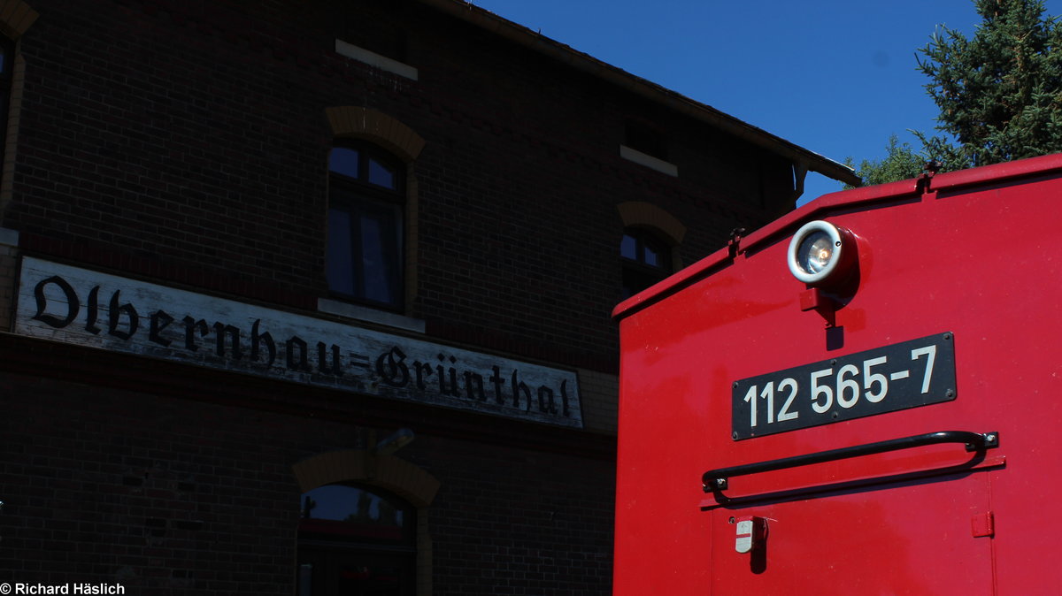 Am 03.07.2018 steht 112 565-7 im Bahnhof Olbernhau-Grünthal und wartet gleich ihren Motor zu starten um wieder nach Pockau-Lengefeld zu fahren.