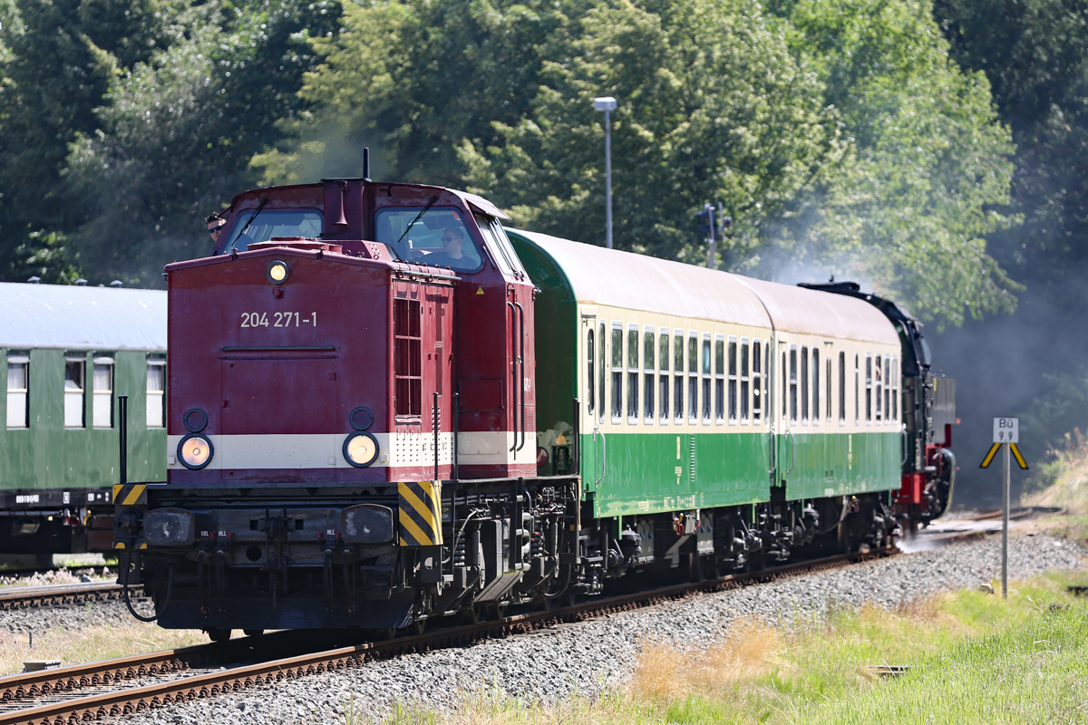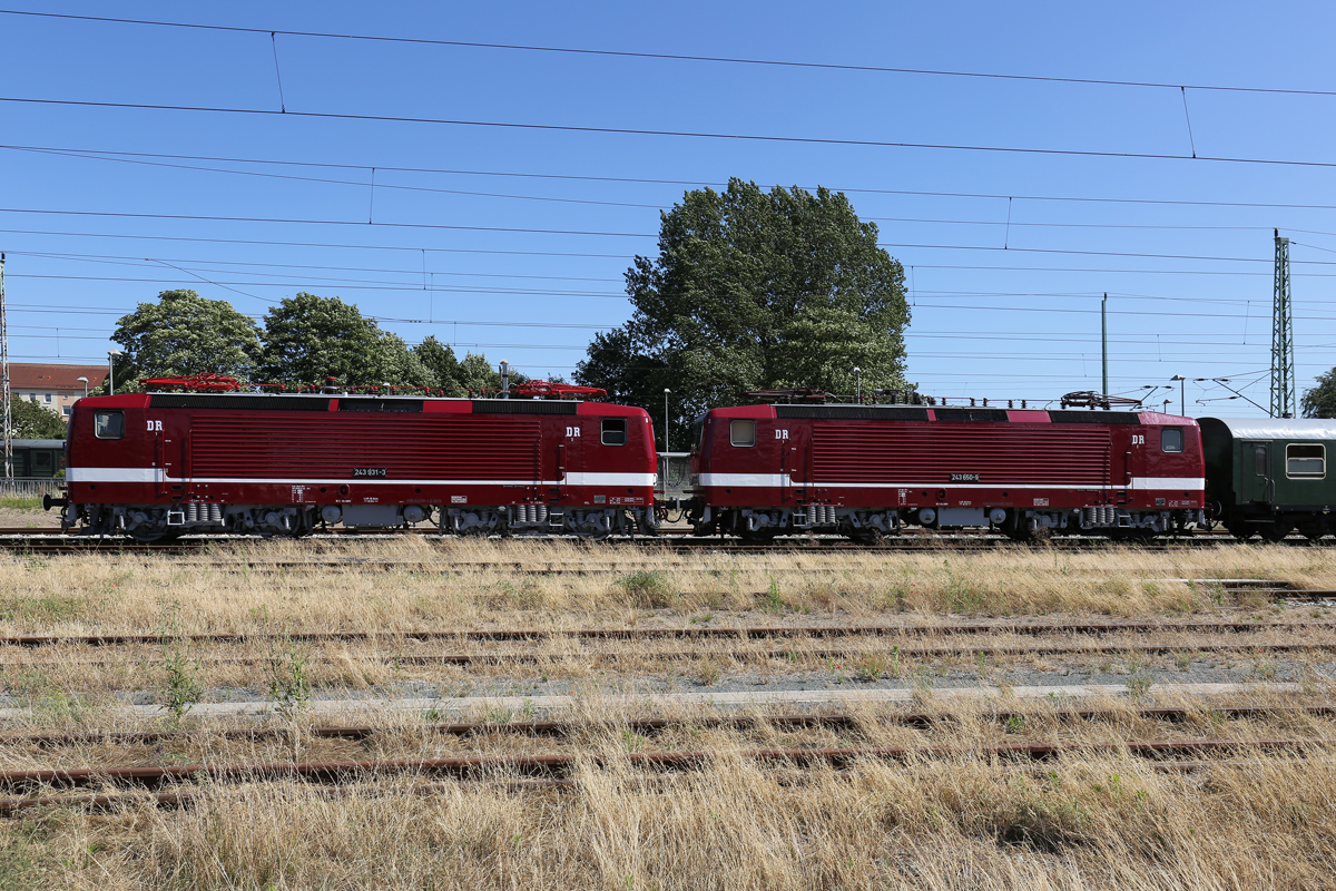 Zwei offensichtlich frisch lackierte DR Lok’s der BR 243 mit historischen Wagen in Bergen auf Rügen abgestellt. - 07.07.2018