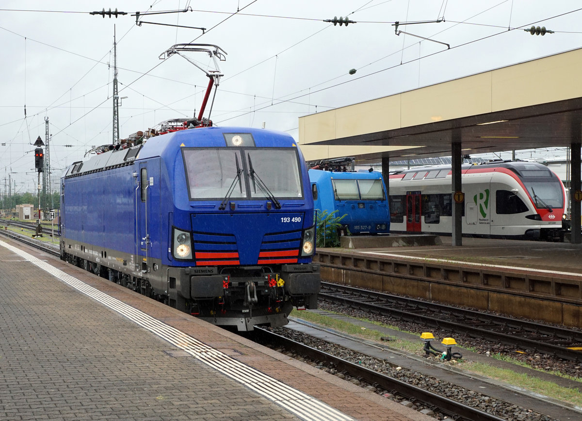 Die Hupac-Vectron 193 490 als Lokzug unterwegs in Basel Badischer Bahnhof am 5. Juli 2018.