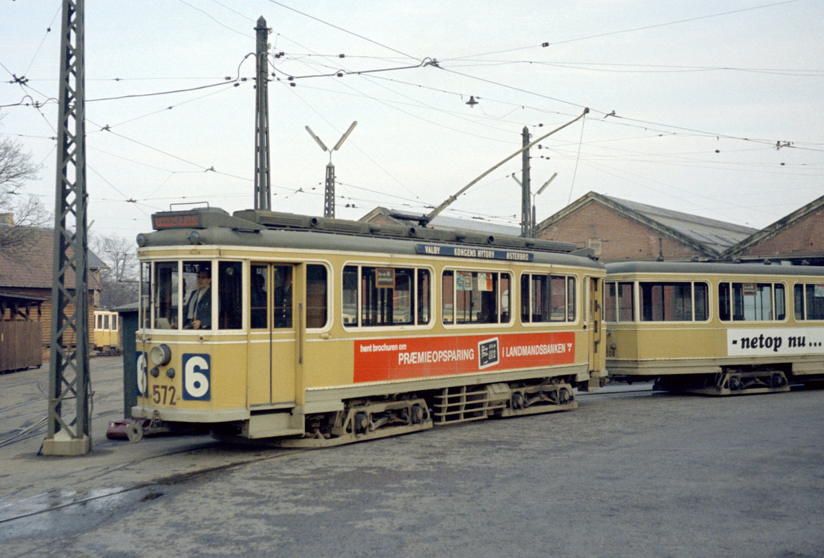 København / Kopenhagen Københavns Sporveje SL 6: Nahaufnahme vom Drehgestelltriebwagen 572. Am 25. April 1969, am vorletzten Betriebstag der Linie 6, hält der Tw am Ålholm Platz im Stadtteil Valby. - Scan eines Farbnegativs. Film: Kodak Kodacolor X.