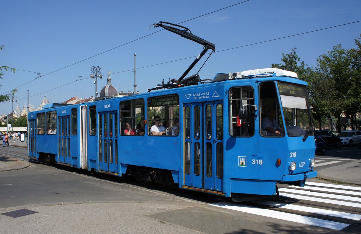 Kroatien / Straßenbahn Zagreb / Tramvaj Zagreb / Zagrebački Električni Tramvaj (ZET): Tatra KT4YU - Wagen 318, aufgenommen im Juni 2018 am Hauptbahnhof in Zagreb.