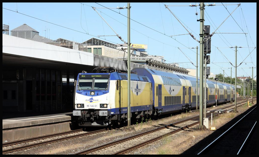 Metronom mit ME 146-01 an der Spitze stand am 2.7.2018 um 9.28 Uhr als RE 2 zur Weiterfahrt nach Göttingen im HBF Hannover bereit.
