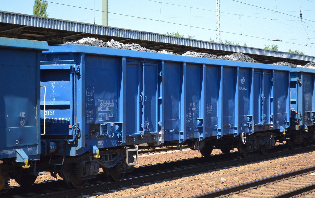 Offener Drehgestellwagen der polnischen PKP Cargo mit der Nr. 31 RIV MC 51 PL-PKPC 5419 551-7 Eanos-xx mit Kohle beladen am 03.07.18 Bf. Flughafen Berlin-Schönefeld.