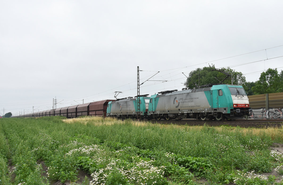 VPS (Verkehrsbetriebe Peine-Salzgitter GmbH) E 186 249-9 und E 186 245-7 in Doppeltraktion kommend aus Richtung Lüneburg. Höhe Bardowick, 26.06.2018.