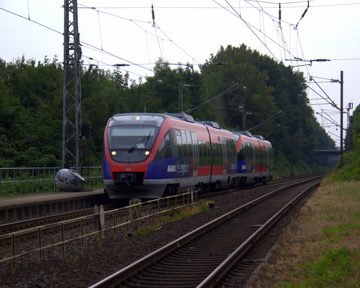 Zwei Euregiobahn (RB20) kommen aus Stolberg-Rheinland-Hbf nach Stolberg-Altstadt,Düren und kammen die Kohlscheider-Rampe hoch aus Richtung Herzogenrath und halten in Kohlscheid und fahren in Richtung Richterich,Laurensberg,Aachen-West,Aachen-Schanz,Aachen-Hbf,Aachen-Rothe-Erde,Aachen-Eilendorf,Stolberg-Hbf(Rheinland). Aufgenommen von Bahnsteig 1 in Kohlscheid. Bei Sommerwetter am Nachmittag vom 4.7.2018.