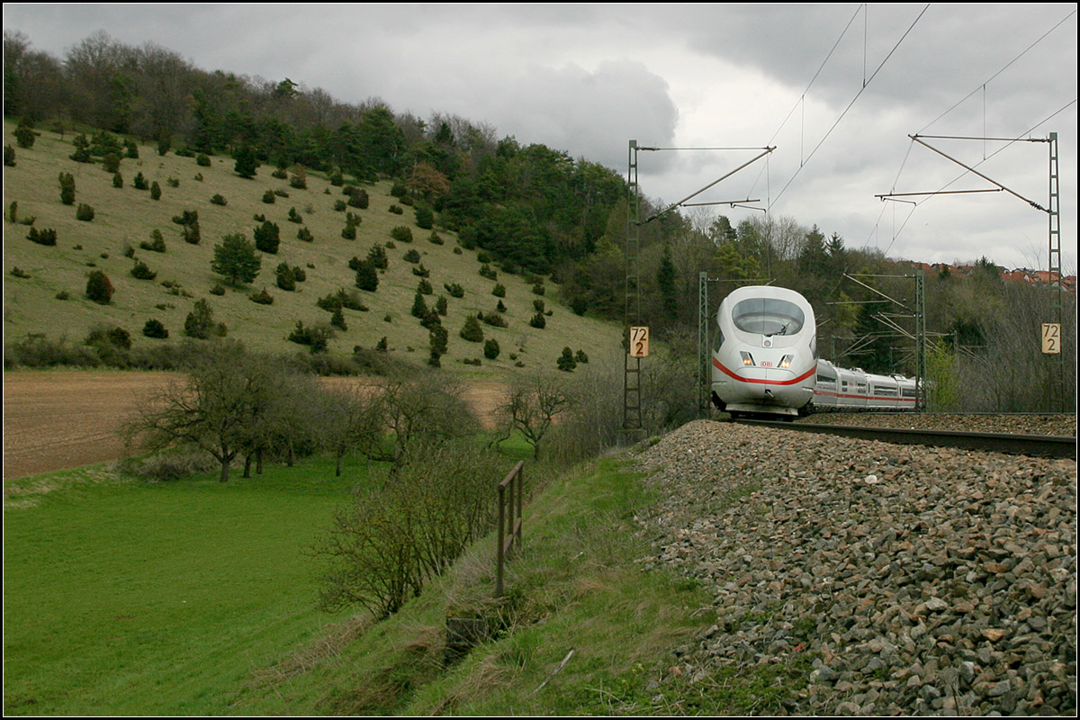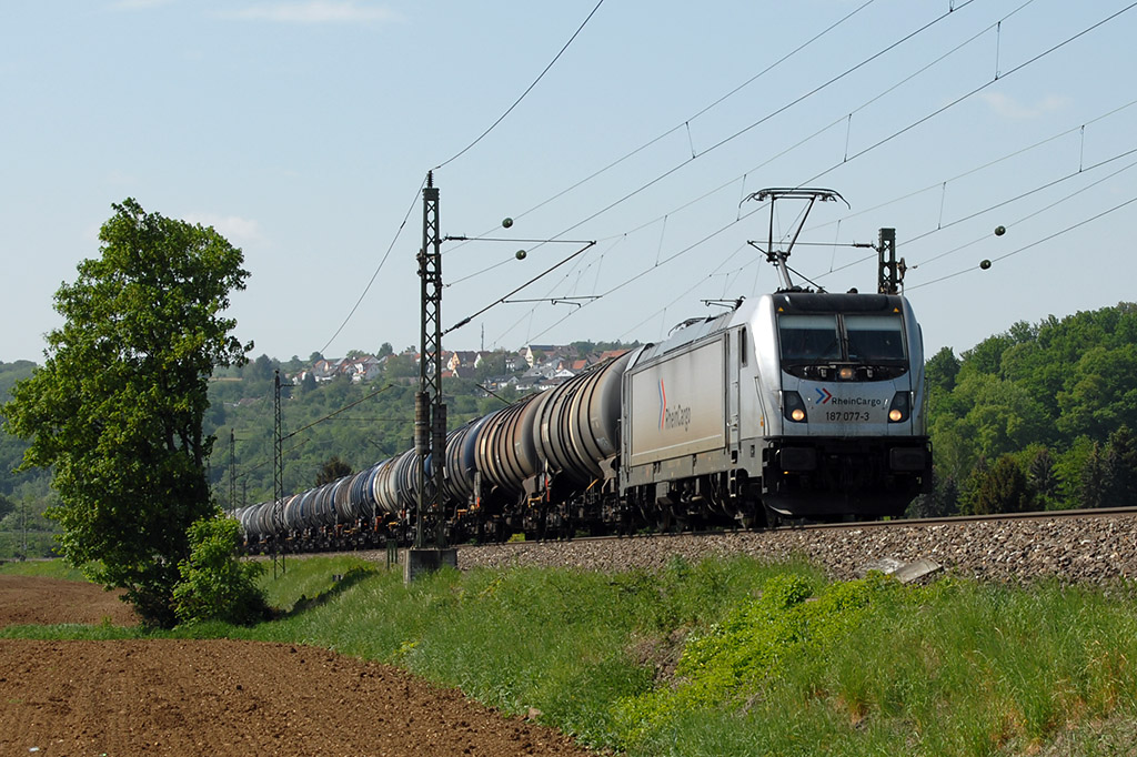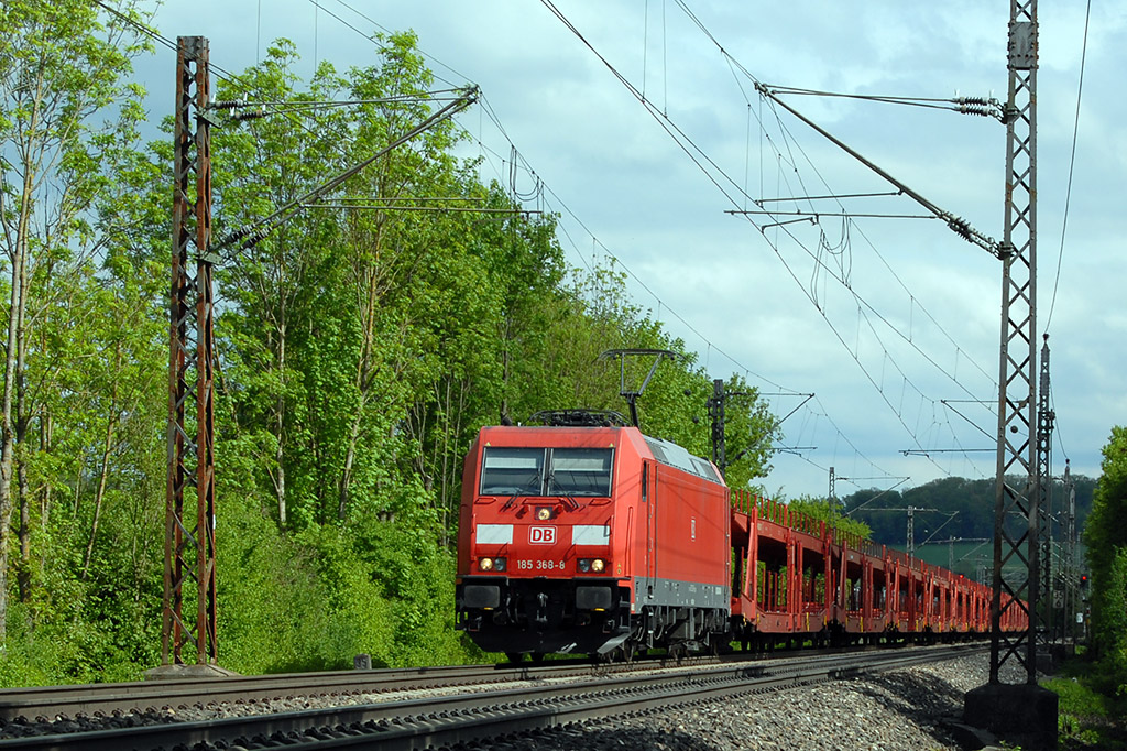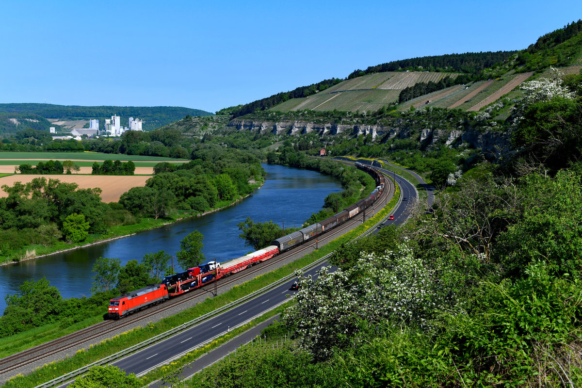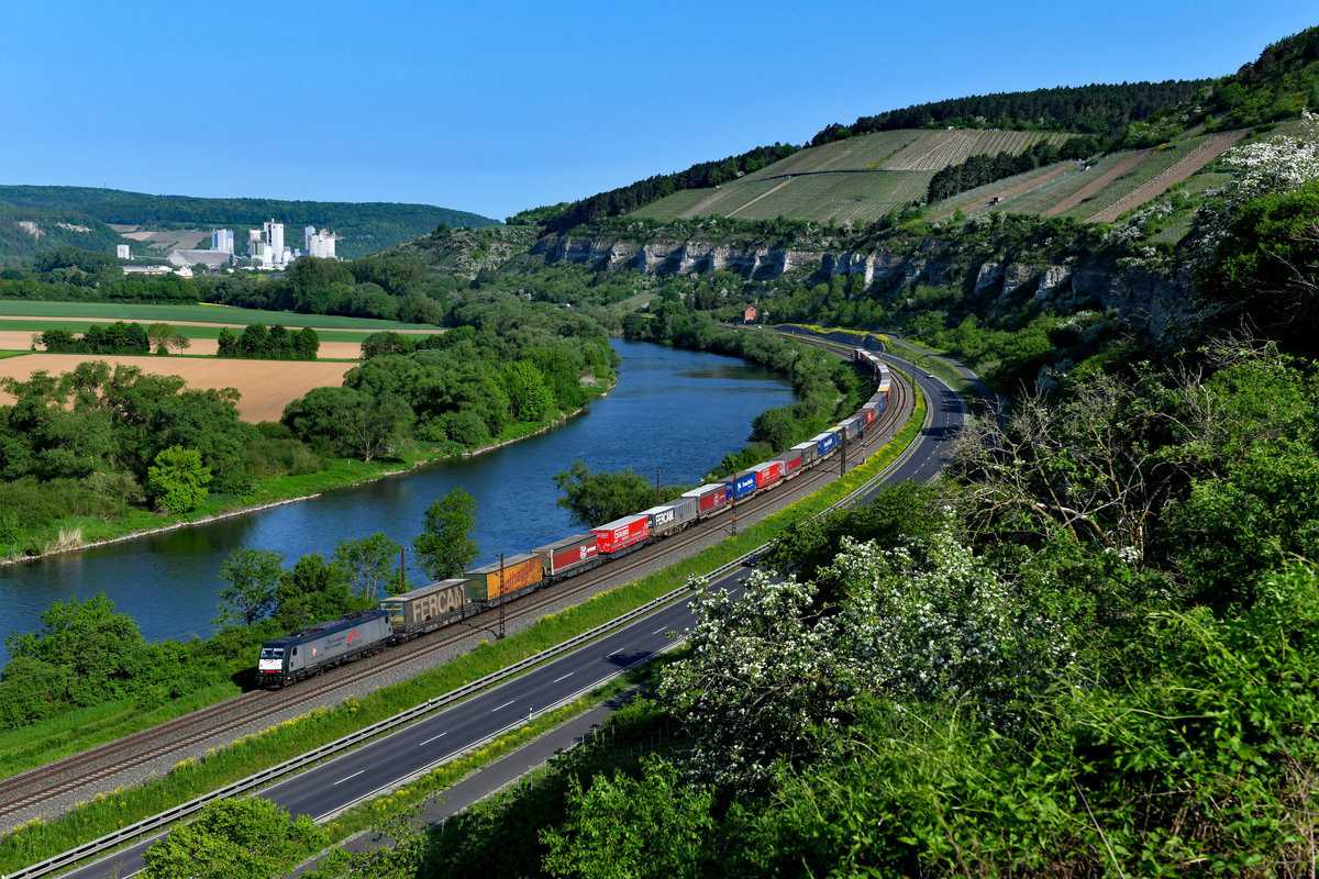 Am 05. Mai 2018 konnte ich aus den Weinbergen zwischen Himmelstadt und Karlstadt heraus die 185 408 mit ihrem DGS 43159 von Köln Eifeltor nach Verona Q. E. aufnehmen. Im Hintergrund erkannt man das Zementwerk der Firma Schwenk.