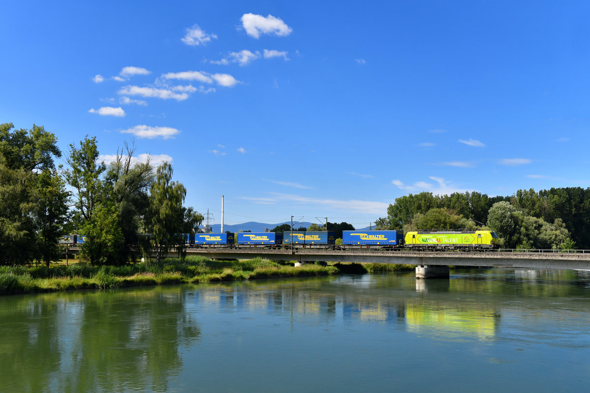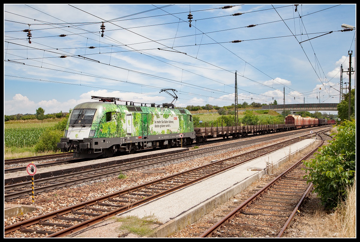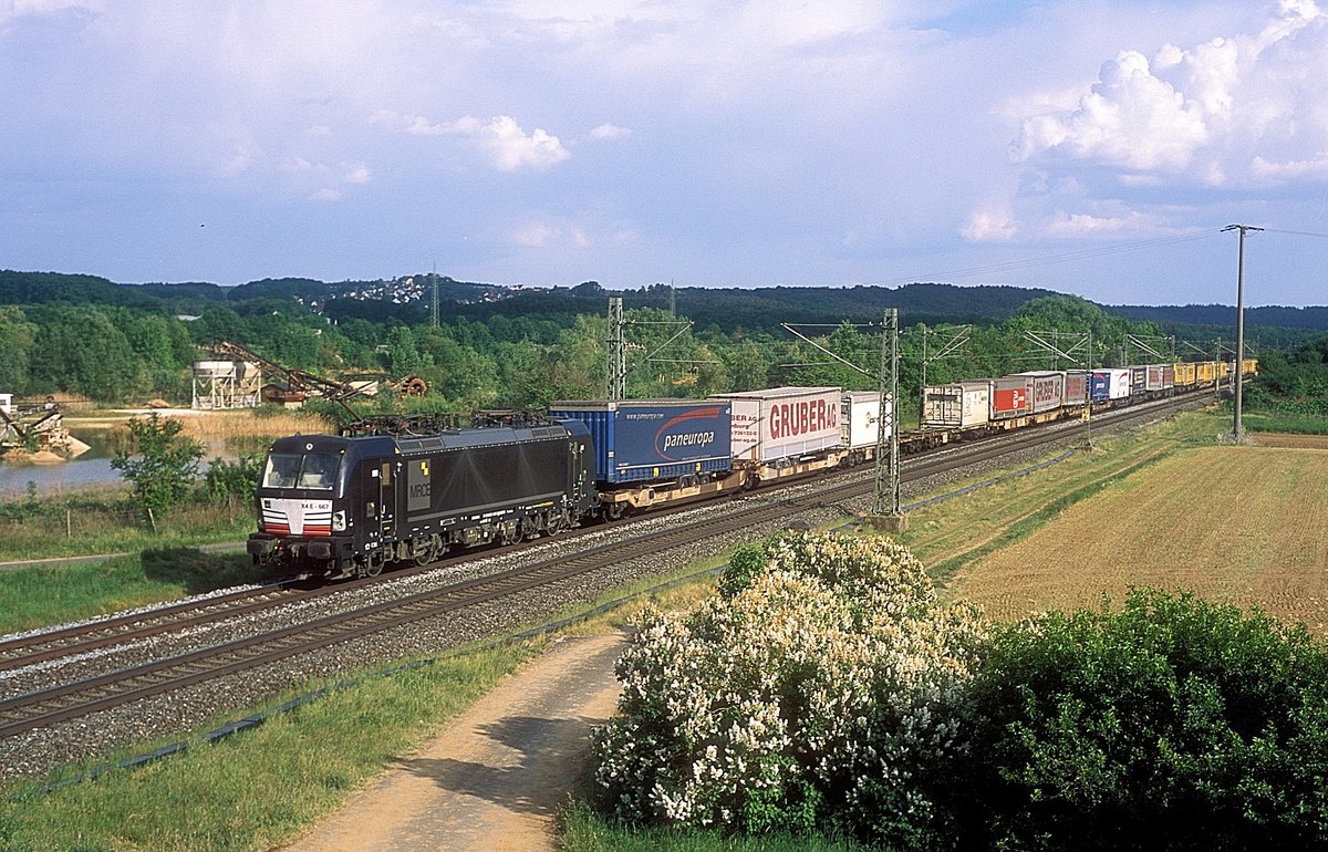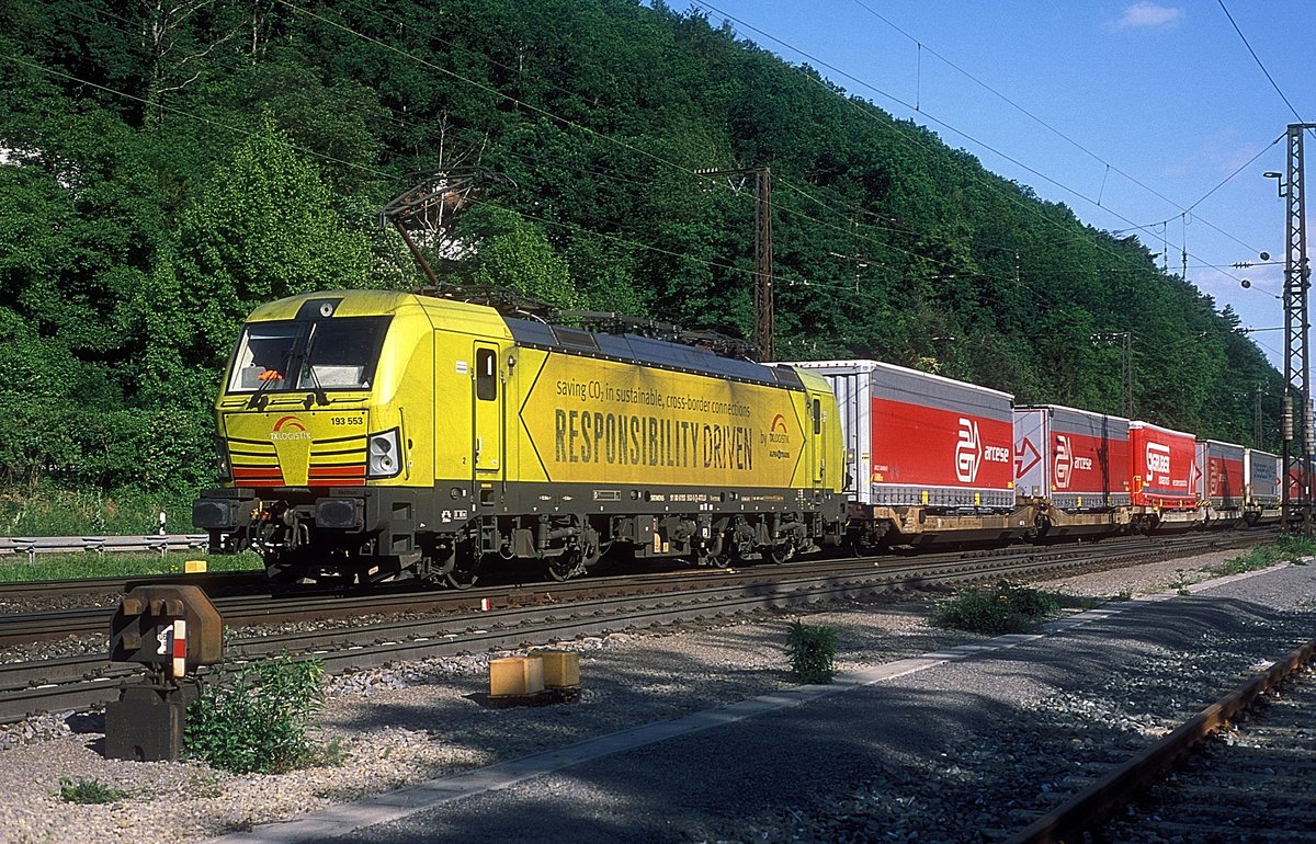 Dem Design der ELL-Vectrons kann ich normalerweise wenig abgewinnen. Es gibt allerdings ein paar wenige Exemplare, deren Gestaltung durchaus gefällig ist. So zum Beispiel die 100. an einen Kunden verleaste Maschine. 193 232 erinnert an diesen Meilenstein und mit dem Namen "Flying Dutchman" an das Geschäftsfeld der LTE - Häfen und Containerterminals in Europa zu verbinden. Am 05. Mai 2018 konnte ich diese Lokomotive mit dem gut ausgelasteten DGS 41966 von Linz nach Maasvlakte bei Wernfeld im Maintal fotografieren.