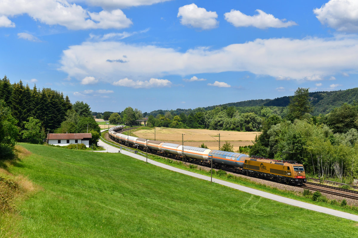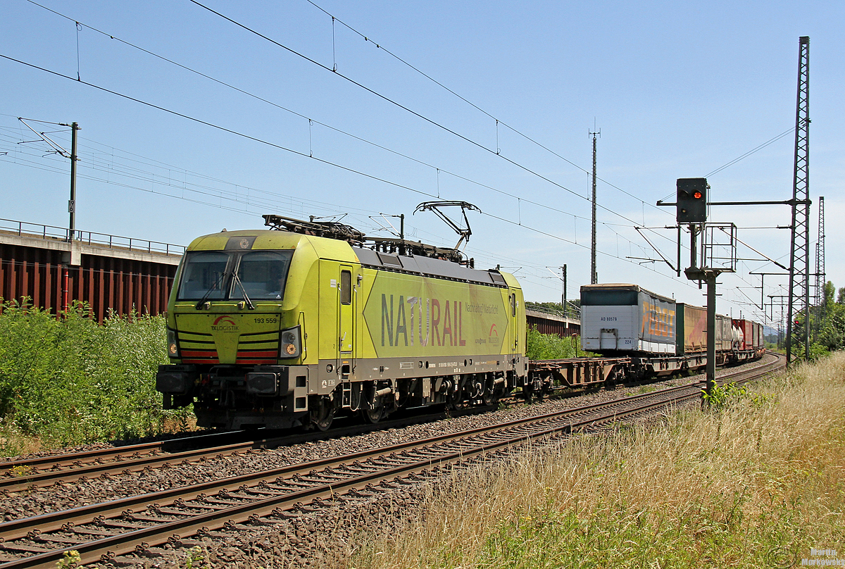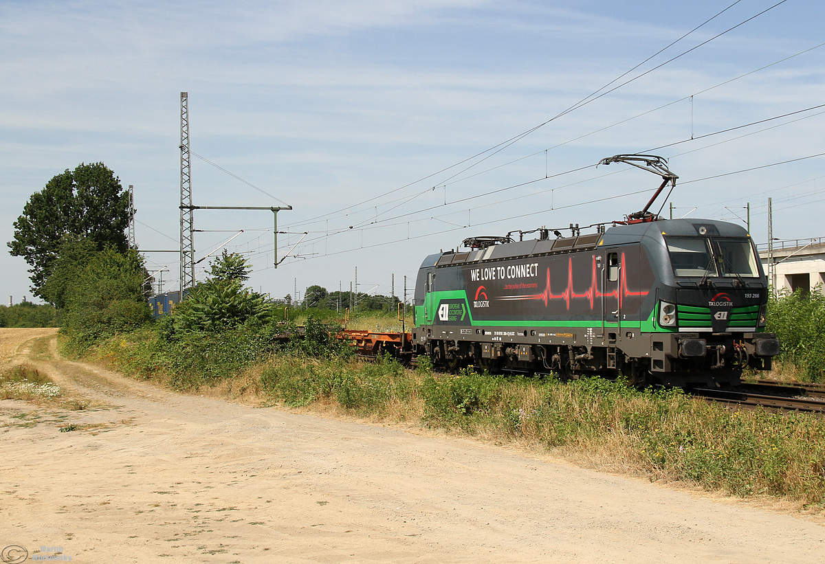 Dem Design der ELL-Vectrons kann ich normalerweise wenig abgewinnen. Es gibt allerdings ein paar wenige Exemplare, deren Gestaltung durchaus gefällig ist. So zum Beispiel die 100. an einen Kunden verleaste Maschine. 193 232 erinnert an diesen Meilenstein und mit dem Namen "Flying Dutchman" an das Geschäftsfeld der LTE - Häfen und Containerterminals in Europa zu verbinden. Am 05. Mai 2018 konnte ich diese Lokomotive mit dem gut ausgelasteten DGS 41966 von Linz nach Maasvlakte bei Wernfeld im Maintal fotografieren.