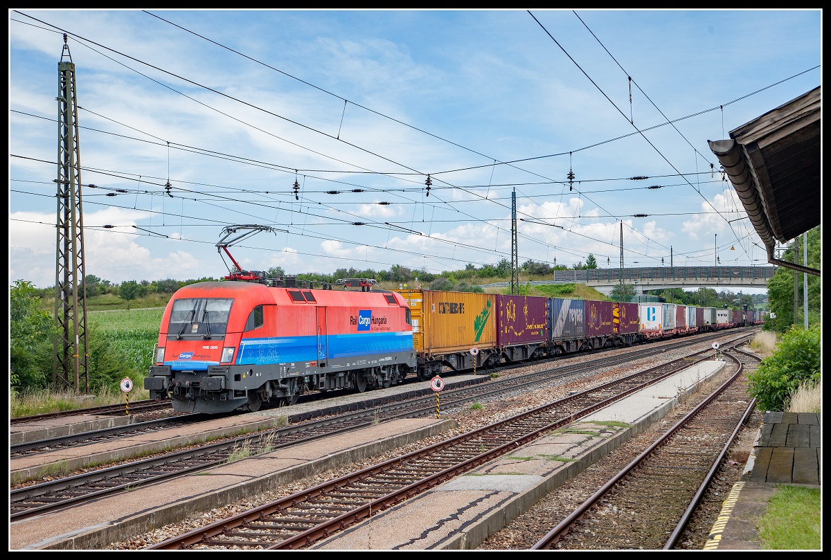 1116 009 fährt am 5.07.2018 mit einem Güterzug durch den Bahnhof Kirchstetten.
