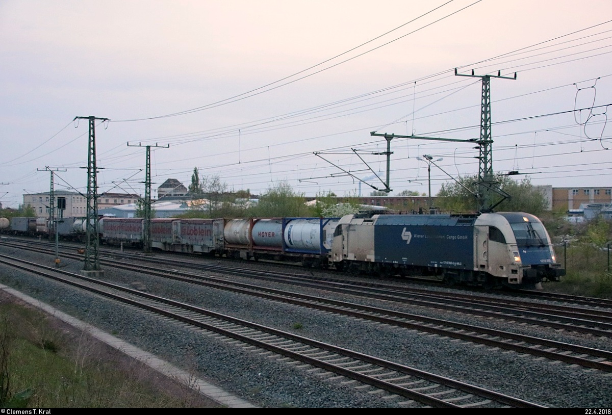 1216 950-6 (Siemens ES64U4) der Wiener Lokalbahnen Cargo GmbH als Containerzug fährt in Halle-Ammendorf auf der Bahnstrecke Halle–Bebra (KBS 580) Richtung Halle (Saale). [22.4.2018 | 20:11 Uhr]