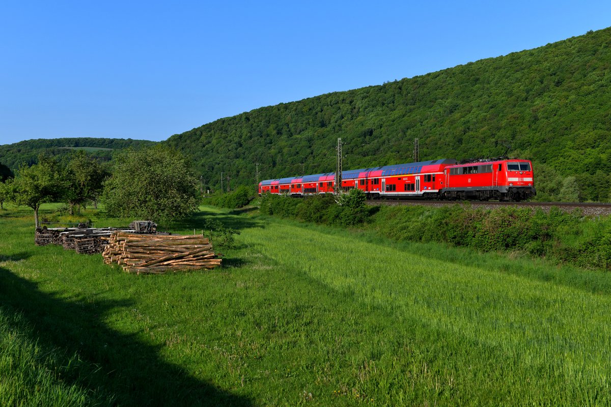 Auch am 05. Mai 2018 konnte 111 106 mit einer Doppelstock-Garnitur im Maintal beobachtet werden. Hier ist sie als RE 4603 bei Wernfeld in Richtung Würzburg unterwegs.