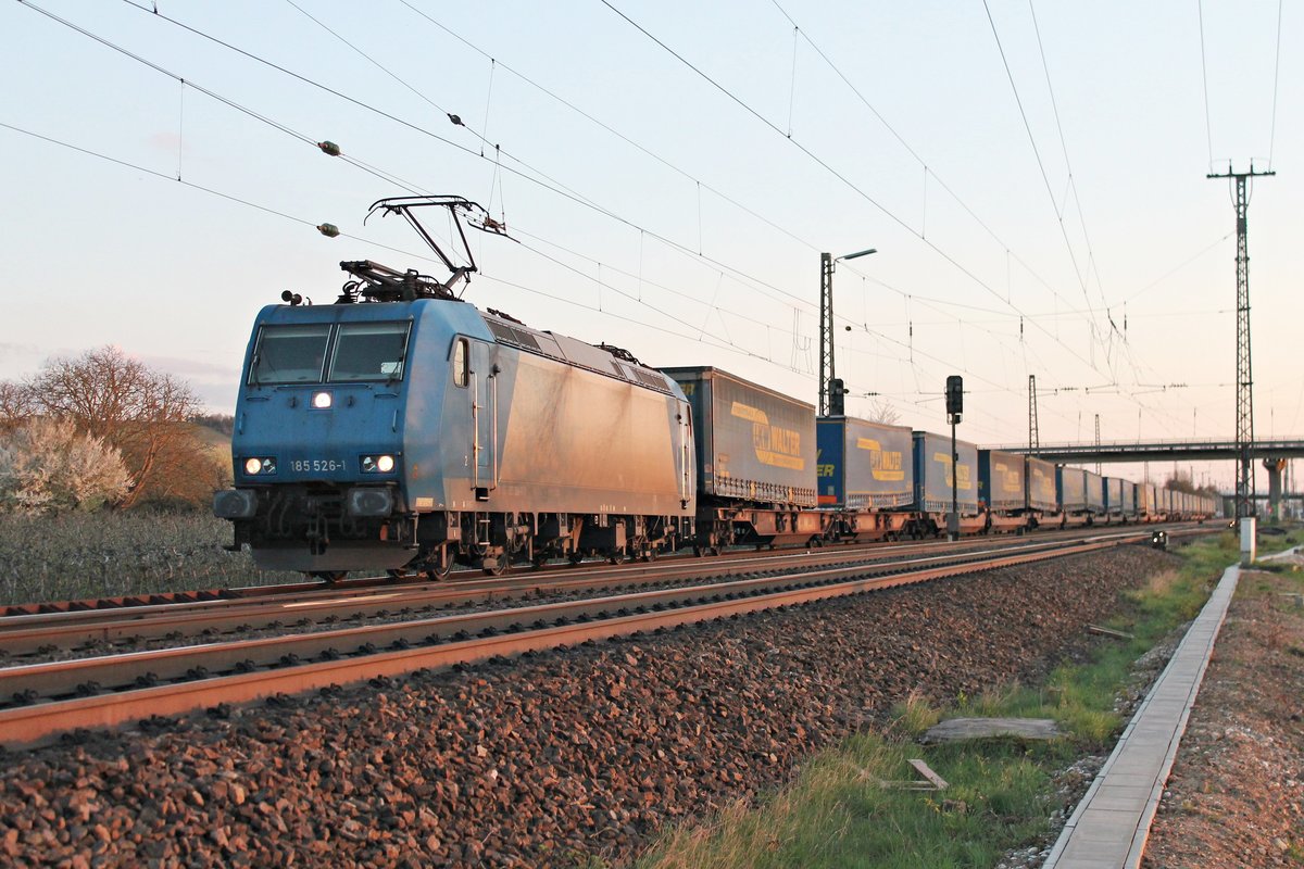 Ausfahrt im letzten Tageslicht vom 28.03.2017 von ATLU/XRAIL 185 526-1 mit einem "LKW Walter"-KLV nach Belgien, den sie bis Aachen West bespannt, aus dem Überholgleis von Müllheim (Baden) in Richutng Norden.