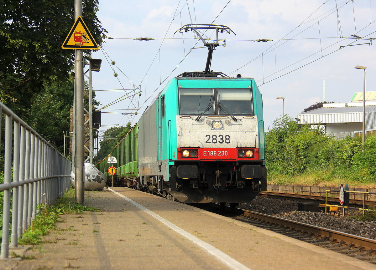Die Cobra 2838 kommt die Kohlscheider-Rampe hoch aus Richtung Mönchengladbach,Herzogenrath mit einem schweren Holzzug aus dem Ruhrgebiet nach Belgien und fährt durch Kohlscheid in Richtung Richterich,Laurensberg,Aachen-West.