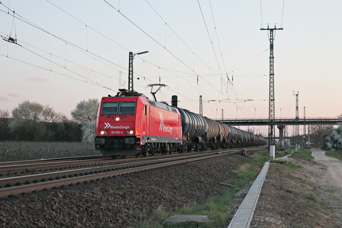 Durchfahrt am Abend des 28.03.2017 von Maqaurie/RHC 2051 (185 582-4) mit einem leeren Kesselzug durch die Gleisanlagen von Müllheim (Baden) in RIchutng Freiburg (Breisgau).