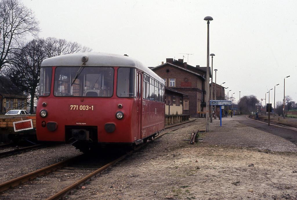 Eine Ferkeltaxe und zwar 771003 stand am 4.10.1994 auf dem Stumpfgleis im Bahnhof Hohenwulsch.
