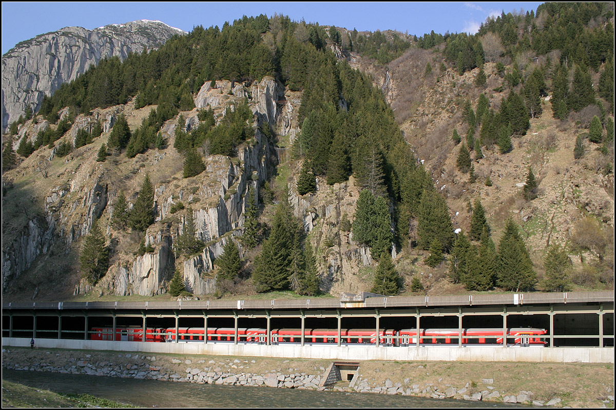 ... vor Steinrutschungen und Lawinen: Ein Zug der Matterhorn-Gotthard-Bahn auf der Schöllenenbahn in einem Galerieabschnitt bei Andermatt.