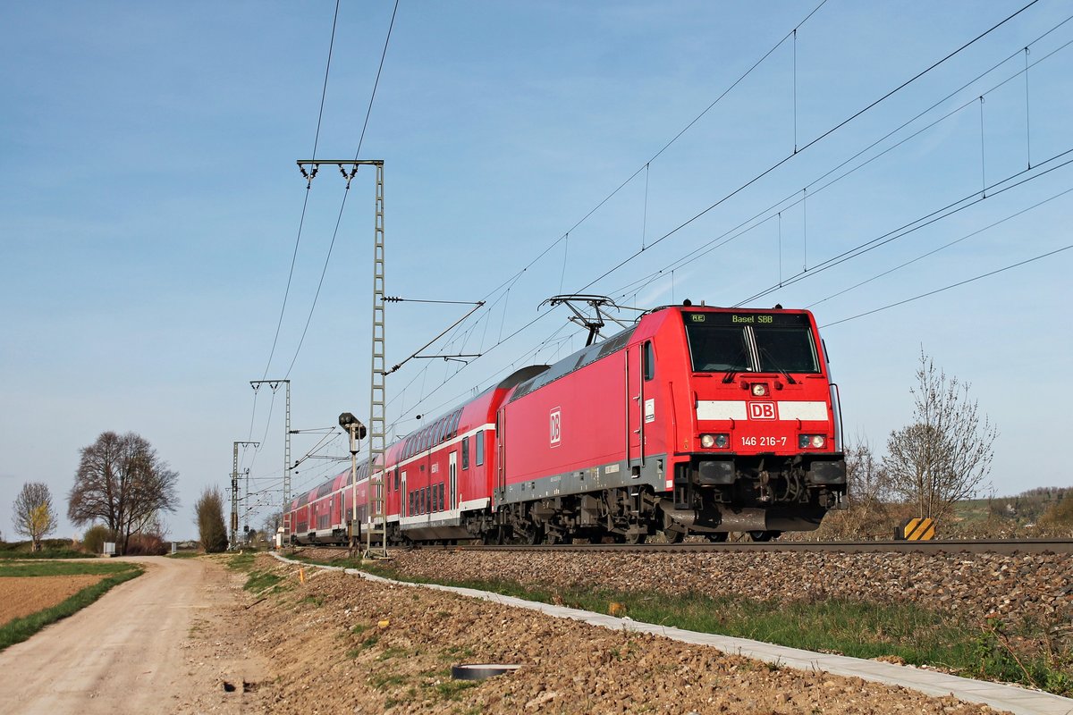 In Kürze erreicht die Freiburger 146 216-7 ihren nächsten Zwischenhalt in Müllheim (Baden), als sie am 29.03.2017 einen RE (Offenburg - Basel SBB) bespannt.