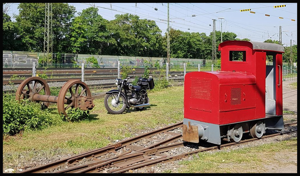 Jüngeren Besuch in Form eines DKW Motorrades 250R bekam am 26.5.2018 die weitaus ältere, Baujahr 1938, Feldbahnlok 4 "Annette" im Westfälischen Feldbahn Museum in Lengerich.