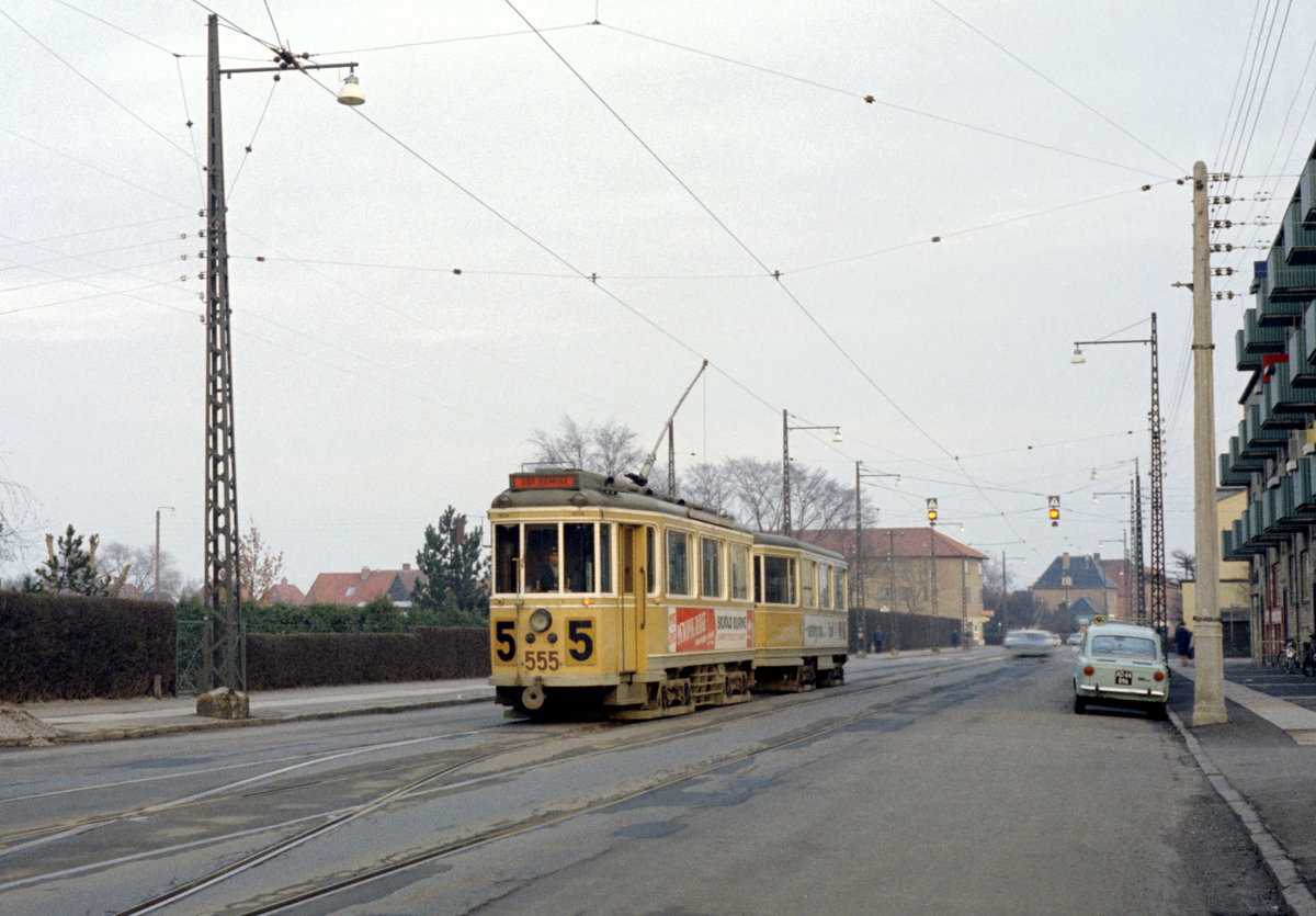 København / Kopenhagen Københavns Sporveje SL 5 (Tw 555 + Bw 15**) København S, Sundbyøster, Backersvej / Kretavej am 25. April 1969. - Das Ziel des Zuges war der Straßenbahnbetriebsbahnhof Sundby - man bemerke das rote Zielschild, das zeigt, dass das Ziel nicht eine der normalen Endstellen der Linie (Husum bzw. Formosavej) ist. Um den Betriebshof zu erreichen oder vom Betriebshof zur Stammstrecke zu kommen , benutzten die ein- und ausziehenden Züge die Betriebsstecke Backersvej - Grækenlandsvej über die Kretavej. - Scan eines Farbnegativs. Film: Kodak Kodacolor X.