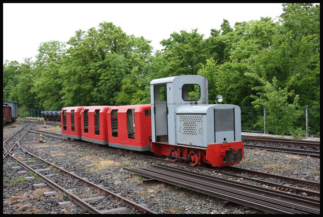 Lok 16 "Klara" ist hier am 25.5.2015 mit einem Personenzug, bestehend aus Grubenwagen, im Freigelände des Westfälischen Feldbahn Museum in Lengerich zu sehen. Der Lok sieht man das Baujahr 1919 wahrlich nicht an.