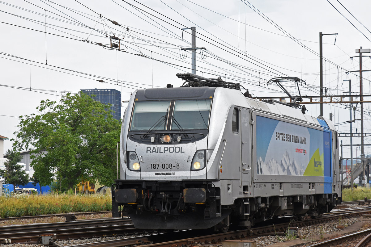 Lok 187 008-8 durchfährt den Bahnhof Pratteln. Die Aufnahme stammt vom 29.06.2018.